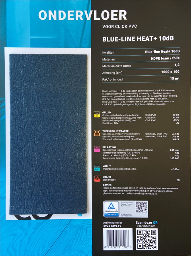 De Blue-line Heat+ 10 dB is ideaal in combinatie met click pvc vloeren die vloerverwarming en vloerkoeling hebben, dit komt door de erg lage warmtedoorlaatweerstand. Lees meer