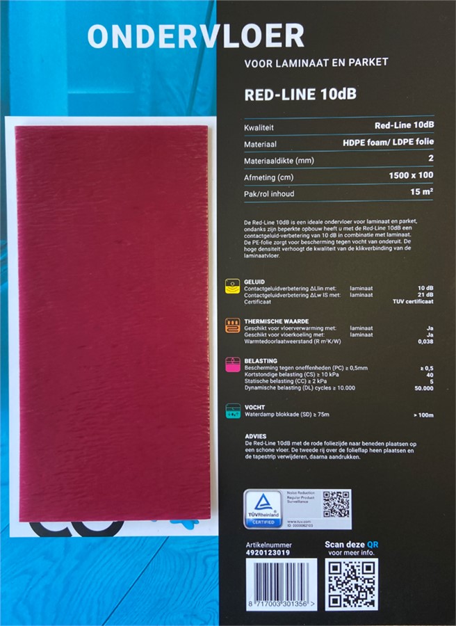 Red-line 10dB is een ideale ondervloer voor laminaat en parket, ondanks de beperkte opbouw heeft u met deze ondervloer een contactgeluid-verbetering van 10dB in combinatie met laminaat. Door het PE-folie kan vocht van onderuit niet de vloer aantasten en geeft het dus een goede bescherming.